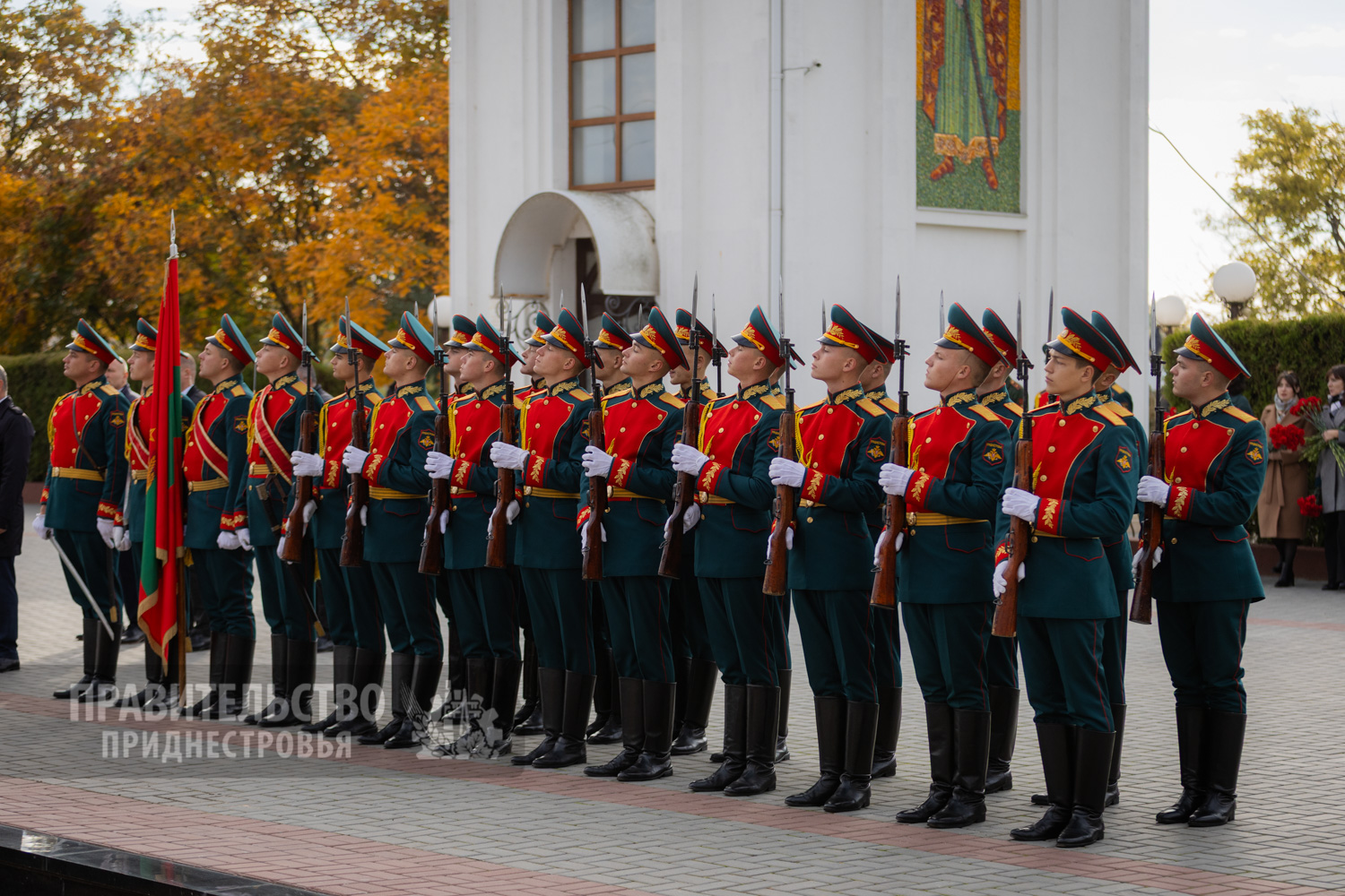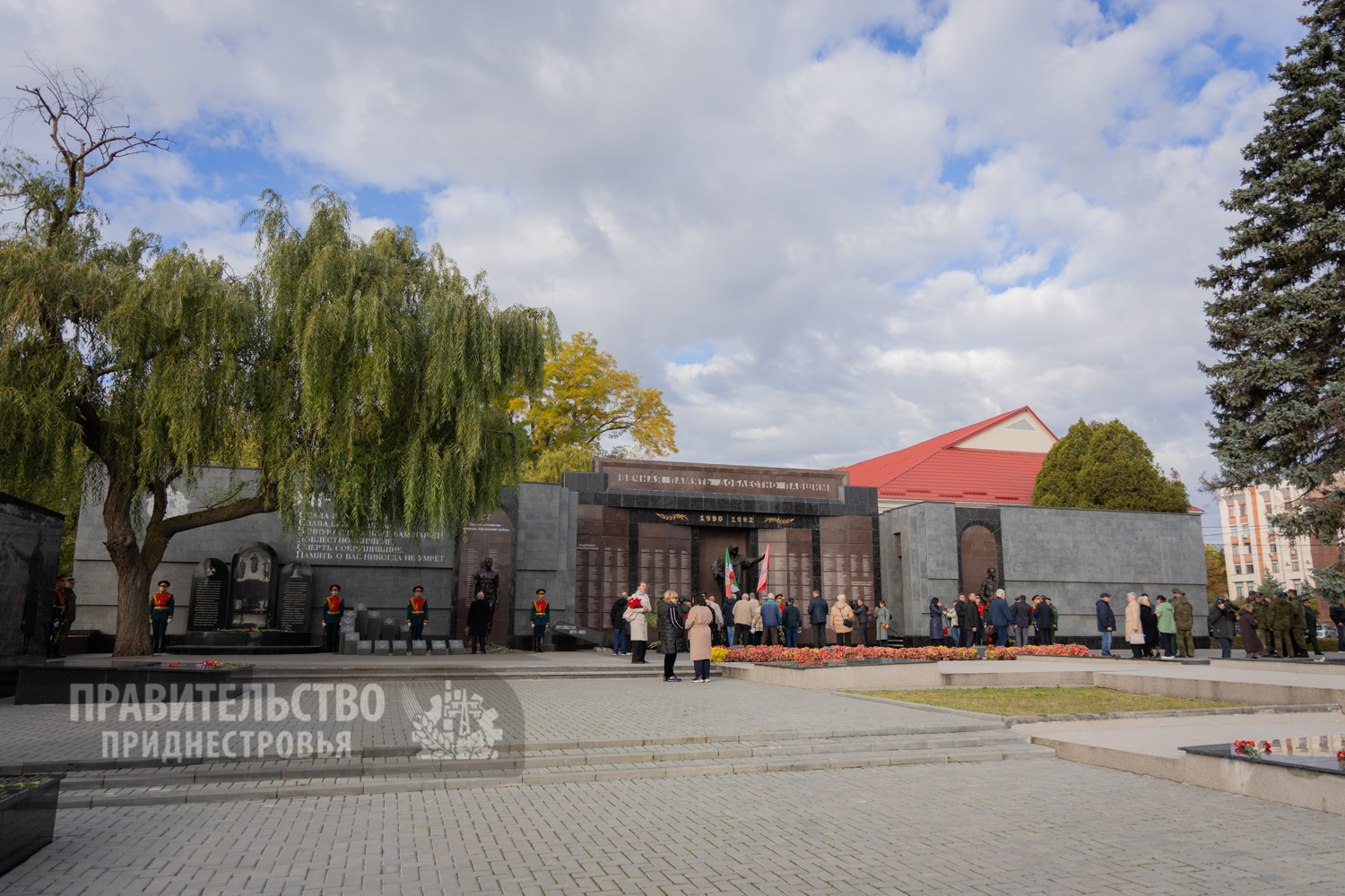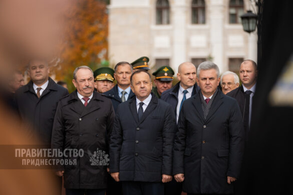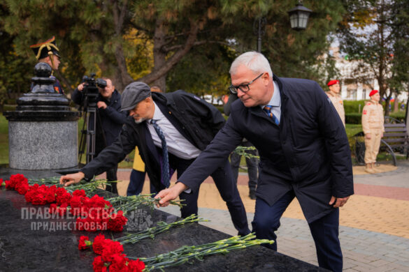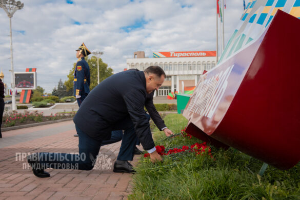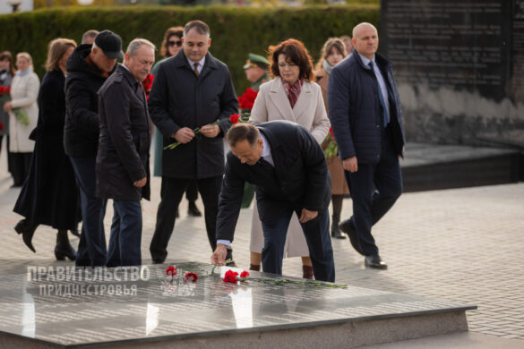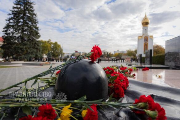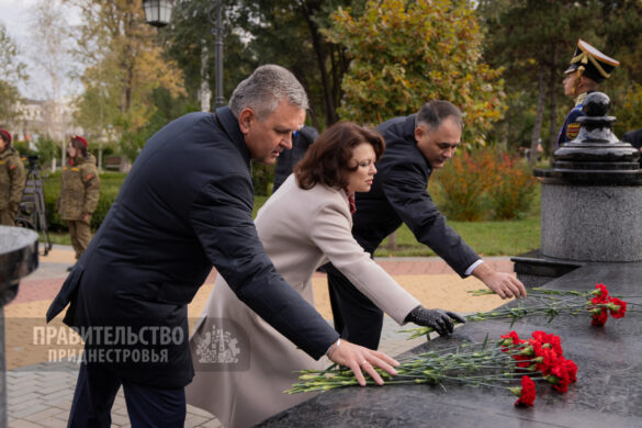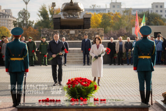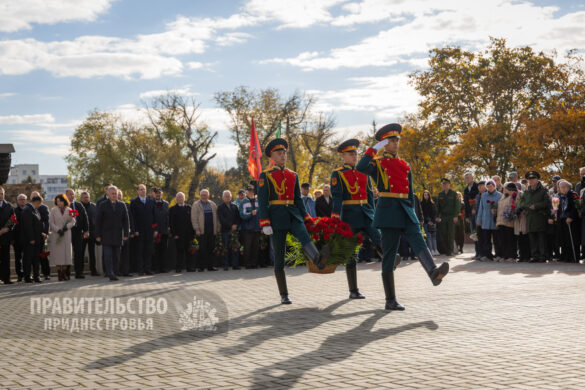 Традиционные торжественные мероприятия неизменно начинаются на священном для каждого приднестровца месте – Мемориале Воинской Славы, где покоятся защитники Отечества различных эпох. Здесь под звуки метронома гости и жители столицы отдали дань уважения воинам-освободителям. К Вечному огню, могиле Неизвестного солдата и захоронениям павших солдат и офицеров были возложены венки и живые цветы. Первыми к месту памяти подошли Президент Вадим Красносельский, Председатель Правительства Александр Розенберг и Председатель Верховного Совета Александр Коршунов. Торжественность момента подчеркивали залпы салютной группы и звучащая на Мемориале музыка в исполнении оркестра Главного штаба Вооруженных Сил ПМР.